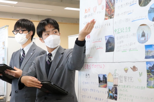 SHRが終了後、3年生は会場である協創ルームに集まり、最後の打ち合わせを行いました。昨日も残ってリハーサルをしている班や、最後までポスターに修正を加えている班がありました。どの生徒もやや緊張した面持ちで、真剣に打ち合わせをしています。