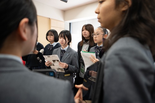 時間となり、いよいよ1回目の発表が始まりました。最初は中学1年生、教職員、保護者の方がオーディエンスです。 3年生たちは自分たちの発表を聞いてもらおうと、元気よく声を出して、オーディエンスを集めていました。集まった人には自分たちの発表内容をまとめたチラシを配布し、それを参考にしてもらいながら聞いてもらいます。