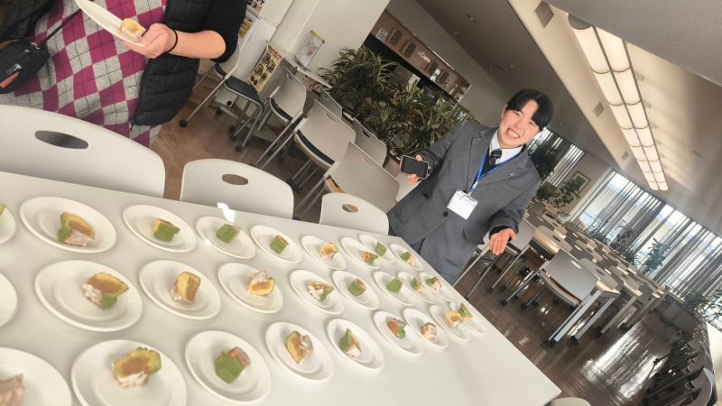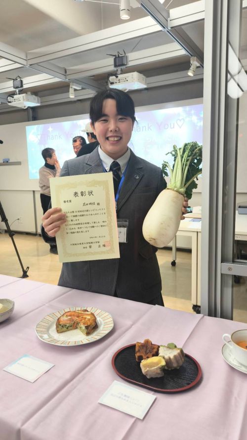 このメープル饅頭ならぬモミジ饅頭を「ぶち美味しい!田辺大根もみまんじゃけぇ」と名付け、第10回田辺ダイコンレシピコンテスト(主催:大阪総合保育大学短期大学部)に応募したところ、書類審査を突破することができました。1月23日(金)に同短期大学で開催された最終審査会において、花田さんの作品は優秀賞を受賞!審査会後の作品試食会では、「このモミジ饅頭は、商品化すべきだ」と多くの審査員の方々から高い評価をいただくことができました。