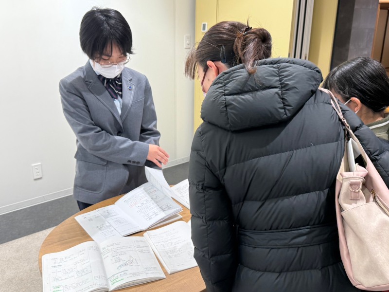 そのそばでは、生徒たちが書いた各教科のノートやフォーサイト手帳を展示したののですが、児童、保護者の方は興味津々の様子でした。中には、そのノートを書いた自治会の生徒に、中学生活の様子を熱心に聞いていらっしゃる保護者の方や、ノートの写真を何枚も撮影されている方もいらっしゃり、今回のこのプログラムが、入学前の不安の解消に少しでも役に立てばと思いました。