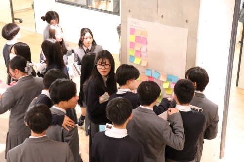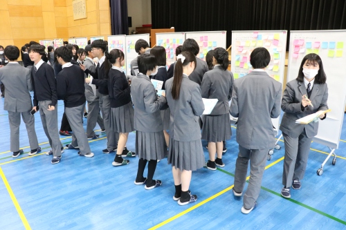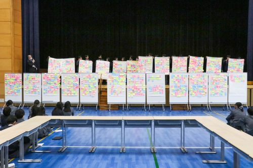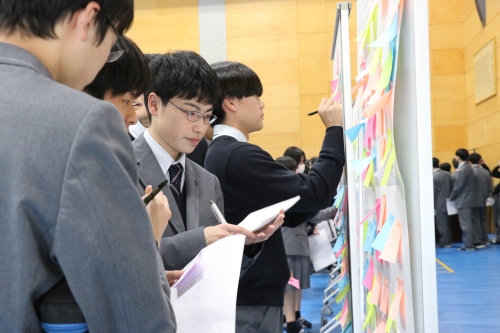 聴く側となる高校1・2年生と来てくださった保護者の皆様は、発表に耳を傾け、発表者へ質問を投げかけてくれました。発表の内容に関する助言や感想を付箋に書いてもらい、各班の決められた場所に貼ってもらいました。