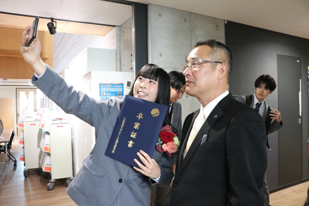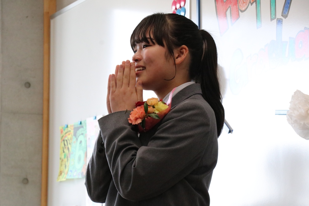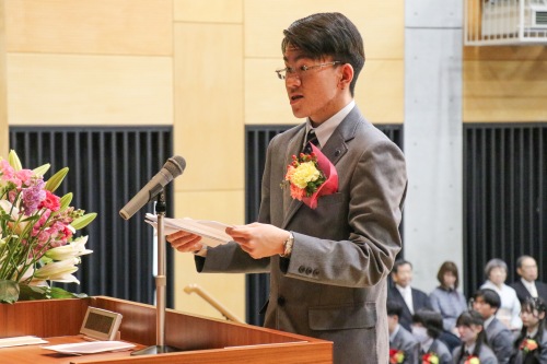 卒業生答辞では、3年間を振り返り、過去に戻ってやり直したいこともあるけれど、この卒業を新しい未来へのスタートとして頑張っていくという決意を述べたあと、支えてくれた家族、指導してくださった先生方、いっしょにがんばった仲間への感謝の思いが伝えられました。