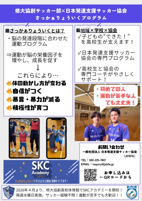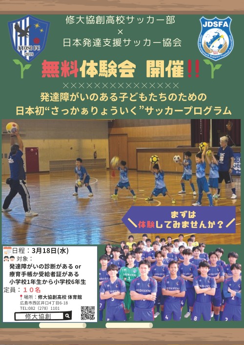 修大協創高校サッカー部と一般社団法人日本発達支援サッカー協会(JDSFA)が連携し、発達障がいのある子どもたちを対象とした日本初の“さっかぁりょういく”プログラムの無料体験会を開催します!!