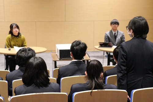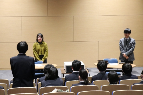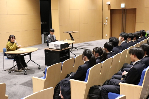 その後の学校説明では、校長より本校の教育の特色や学びの考え方、学校生活について説明を行いました。また、砂谷中学校出身の在校生・卒業生も参加し、中学生のみなさんからの質問に答えながら、高校生活のリアルな体験や進路選択について語りました。