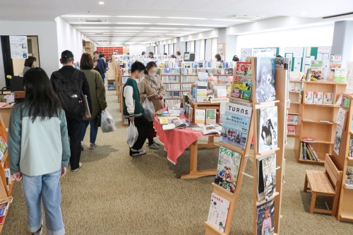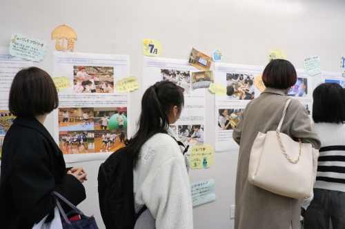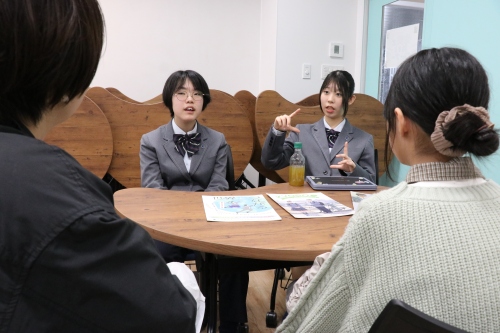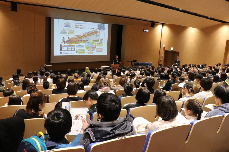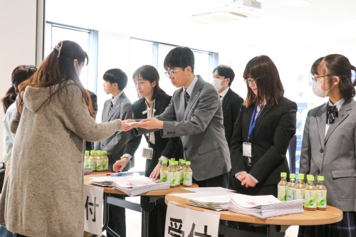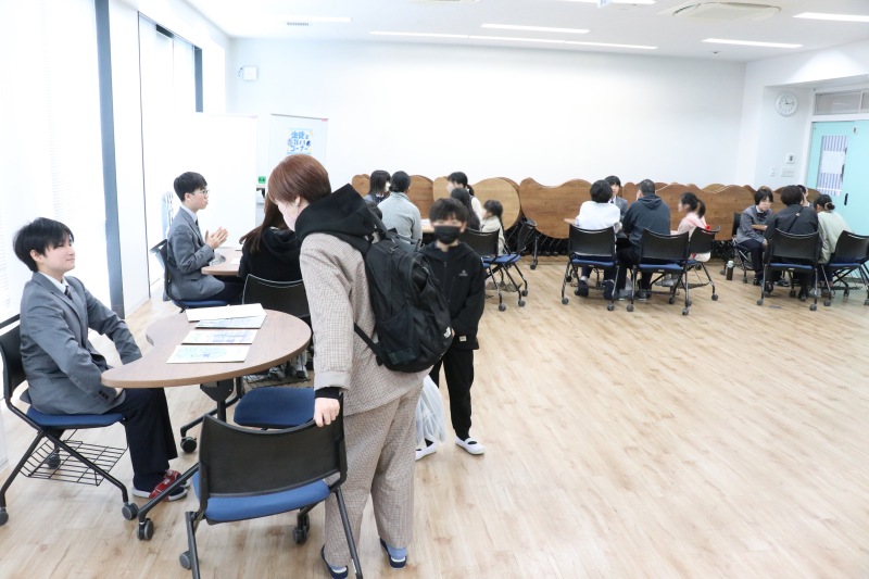 全体での説明が終了後、校舎見学やブース形式による「先輩たちと話そう」が行われました。中学校舎のあちこちに掲示された、中学生たちが作成した職場体験、研修旅行のポスターを熱心に読まれる方、中学生からまさに「ホット」な中学生活を聞かれる方など、終了時間ぎりぎりまで多くの方々が残られていました。