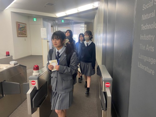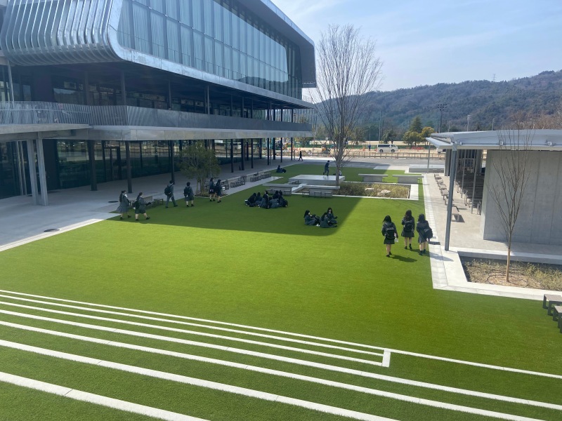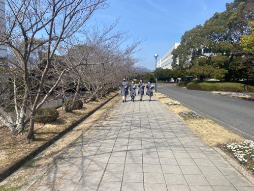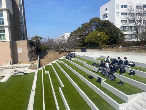 その後は、大学内でウォークラリーを行いました。今回のウォークラリーでは、ボランティア団体「Shuddy's」の学生の皆さんにご協力いただき、キャンパス内を案内していただきました。生徒たちは、大学内に設置された多くの自動販売機を利用したり、新しい体育館の広さに驚いたりしながら、大学ならではの充実した施設を体感していました。また、手入れの行き届いた人工芝の広場で一息つくなど、思い思いにキャンパスでの時間を楽しむ様子も見られました。