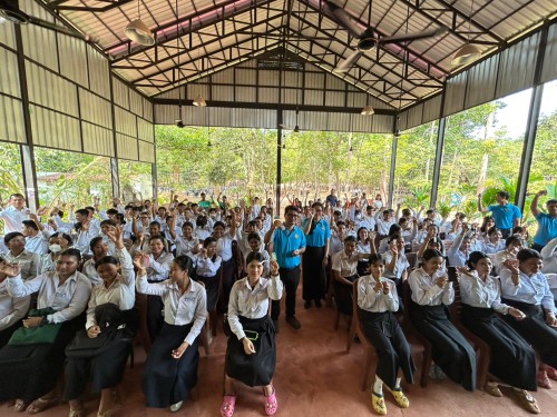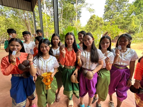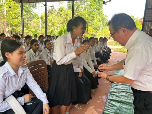 はじめにバイヨン高校/附属中学校の生徒たちによる歓迎のダンスが披露されました。その後は両校の校長による挨拶、そして調印と進み最後に今回の姉妹校提携締結の記念に図書委員や文芸部、自治会、インターアクト部の生徒たちが協力して作成した水引お守りを贈呈しました。お守りの中には「あなたの健康と幸せ、そして明るい未来をお祈りします。あなたと友達になれてとても嬉しいです。」という内容を日本語とクメール語の両方で記載したメッセージを入れています。早速スマホのストラップにする生徒もおり、喜んでもらえたようで一安心です。