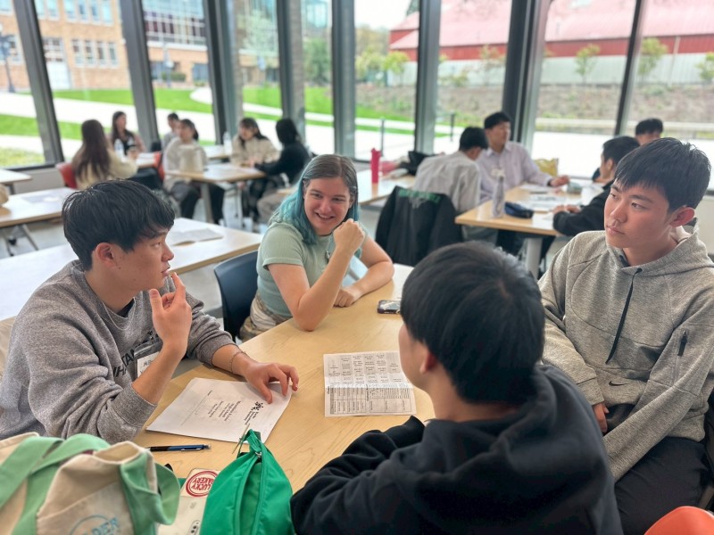 現地スタッフの方に研修場所の説明を頂いた後、さっそく語学研修スタート。3人の現地の高校生も混じって、さまざまな疑問文を使い、お互い質問し合いながら実践を深めていきます。雨も降り肌寒い一日でしたが、交流も深まり笑い声が絶えず、講師のSteve先生にもたくさん褒めていただきました。「自分からどんどん英語で話しかけてごらん」と声かけしながら、この研修を意義深いものにするよう教員も務めます。