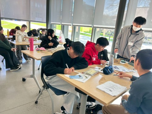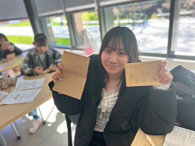 本日はPIA(パシフィック・インターナショナル・アカデミー)語学研修3日目、発音練習に引き続き、後半はホームステイ先や一緒に過ごしてくれたアメリカの学生さんたちに手紙を書きました。お互いに楽しかった思い出を話しながら、思いを綴っていきます。表現の仕方など、先生にも積極的に質問して、真剣な様子をたくましく感じます。