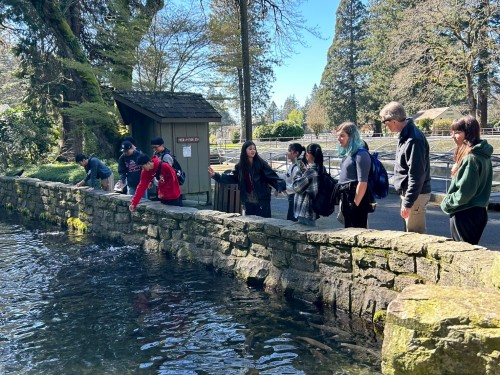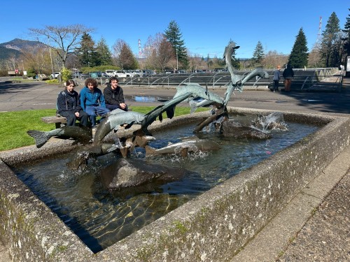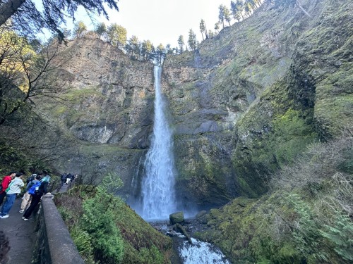 午後は、オレゴン州のコロンビア川やダム湖で養殖されているサーモンや飼育されている巨大なチョウザメを見たり、オレゴン州で有名な滝へ行ったりしました。コロンビア川は川幅が広すぎるため、湖と見間違うほどでした。また、日本では山奥にあるような大きな滝を、都市部からあまり離れていない場所で、しかも間近で見ることができ、その壮大さに息を飲みました。人生で初めて経験することがたくさんあり、とても良かったと思っています。