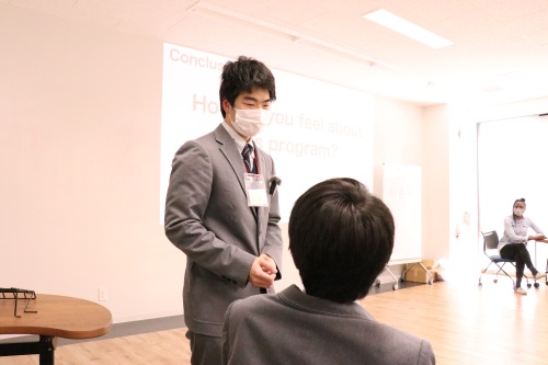 全員のプレゼンテーションの後、ファシリテーターの先生やグループリーダーから一言ずつ助言や激励の言葉をいただきました。グループリーダーの方々は月曜日は生徒が静かであったので、もっと話すようにするにはどうしたら良いか話し合ったりされたようです。しかし、日々の進歩を見ていてとても嬉しかったとのことでした。最後にはしっかり話すようになってとても幸せに思われたようです。