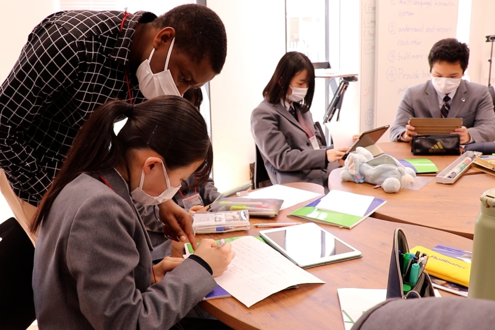 今日の授業では多様性がテーマでした。多様性のある社会とはどういうものか説明があった後、4つの段階に分けて課題が出され、グループリーダーを中心に話し合いが進められました。生徒たちは話を聞きながら質問をし合い、積極的に参加をしていました。まとめとして各グループでそれぞれの国を作り、国名、国旗、国土、言語、通貨など細かな設定を話し合い、発表用にホワイトボードにまとめました。全体発表では各グループの趣向が凝らしたものが見られました。メモを見ることがほとんど無くなっていたことや今まで声が小さかった生徒がはっきり発音できていました。進行役の講師から、多様性のある社会を作るには、新たに建国しなくとも互いが違いを認め合い、配慮し合うことでできるんですよ、と補足説明がありました。休憩後、午前の部は個人のプレゼンテーションの原稿の作成とグループリーダーによる添削で終わりました。
