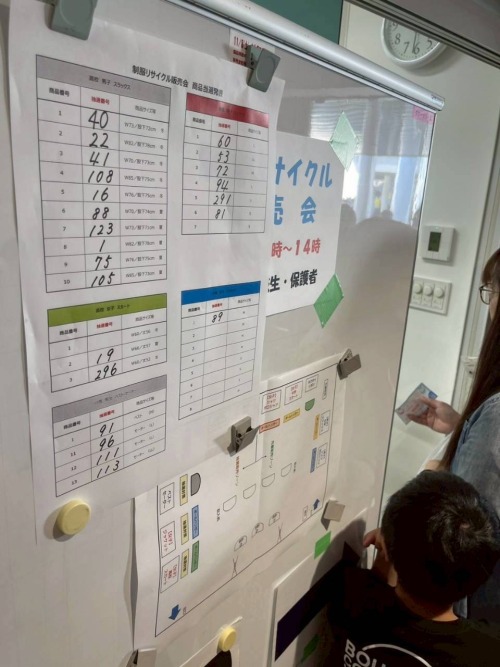 販売開始前から保護者の方々が並び始め、先着販売商品は午前中にほぼ完売しました。制服をご提供いただいた皆様のお陰で盛大に開催することができ、ご来場いただいた皆様に大変喜んでいただけました。準備から販売まで、PTA役員の皆さんとも楽しく活動することができました。