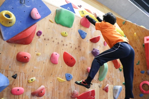 外部コーチから指導を受けながら本校体育館のボルダリングウォールで中学生と高校生が仲良く一緒に練習をしています。筋力を使って壁を登るスポーツだと思われがちですが、どこに手や足をかけるのがいいのか、どういう風に力をかけるのがいいのか、一つ一つ考える知恵の輪のスポーツがボルダリングです。やってみるまでは躊躇しがちなスポーツですが、やってみると楽しさが何倍も味わえるスポーツです。生徒は、この部活動を通して、たくさんの学びをこれからも育んでいきます。