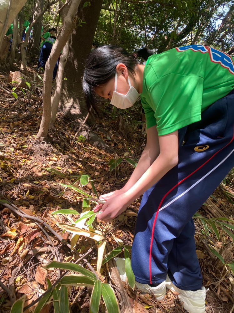 さて、本日の五感活性化プログラムでは、最初に熊笹を採取しに行きました。意外と見落としがちな熊笹ですが、注意して登山道を進むと案外多いことに気付かされます。昨日の悪天候とは打って変わり、木漏れ日の射す清々しい林の中で熊笹を見つけていました。林の中で嗅ぐ新緑の香りや熊笹の手触り、ほんのり苦味のある熊笹茶の味など、日常では体験できない五感をフル活用させた取り組みとなりました。