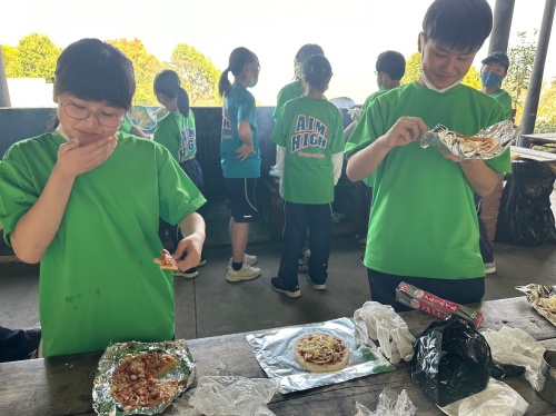 自家製の段ボール窯作りはピザ作りのキモです。燃えやすい部分をアルミ箔でうまく覆わなければなりません。途中、意見の相違や経験の違いなどで思うように進まない場面もありましたが、この研修を通じて学んだ探究力とコミュニケーション力を活用してうまく進めることができました。今年度初めて取り入れたのが、生地作りからピザを完成させることです。薄力粉にぬるま湯を3回に分けて足してこねたり、発酵を促すために15分寝かせたり、生地の手触りや感触の変化が楽しくてたまらないようです。途中工程が増えた分だけ作業の複雑さが増しましたが、3年生の気付かせる支援型のリーダーシップによりスムーズに作業が進んでいったようです。自分たちが生地から作ったダイナミックピザの味は格別のようでした。