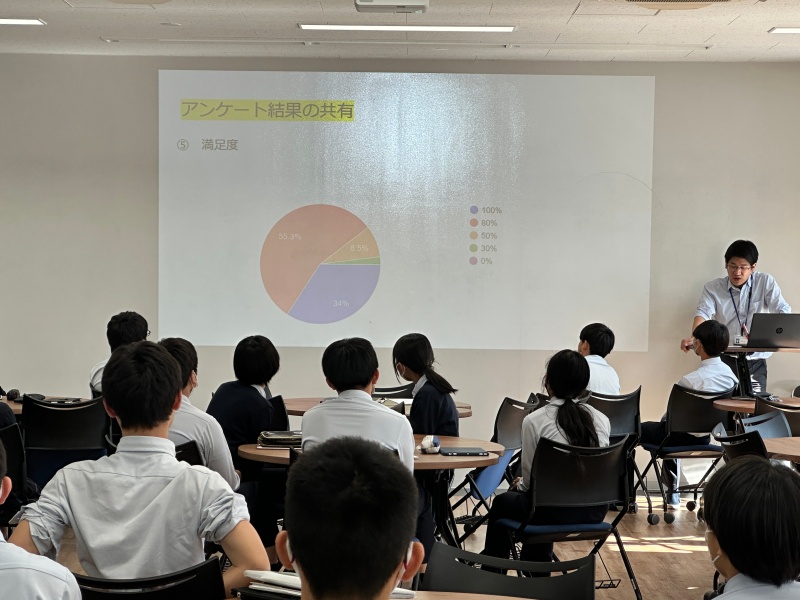 月曜日に実施した研修旅行の事後アンケートの結果を本日共有しました。満足度の結果を見ると、9割以上の生徒が満足しているという結果でした。気づいたことや学んだことの中には「すべてのことを否定するのではなく、できるだけ尊重して、経験することが成長につながる」という意見や「文化や宗教を尊重し、人を大切にする」という意見などが見受けられました。これらの気づきを感想として終わらせるのではなく、次はステップとして課題をまとめ、ポスターセッションに臨む予定です。