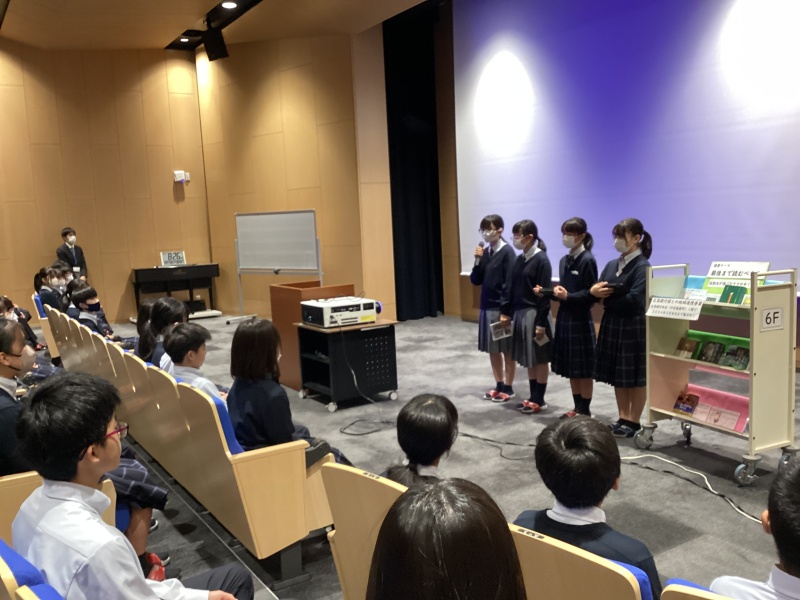 10/30(月)中学集会で、中高図書委員会から広島銀行様との地域連携プロジェクトの報告が行われました。このプロジェクトのリーダーである高校1年矢野さんと古川さんから、6月に実施された選書テーマ本への全校投票に対するお礼が伝えられました。この投票の結果、「最後まで読むべき本」というテーマと「協創生おすすめ本10冊」が選ばれ、図書委員が本の紹介POPを作成した経緯が伝えられました。その後、中学図書委員を代表して、中学1年の植野さんが、瀬尾まいこ著の「そして、バトンは渡された」を、中学2年の大木さんが、雨穴(うけつ)著の「変な家」を紹介しました。このプロジェクトは、中学・高校図書委員が連携して、全校生徒の協力によって成し遂げました。選ばれた「おすすめ本10冊」は、LRC(図書館)で、借りることもできます!今後も、中学と高校の図書委員会が協力してLRC(図書館)を盛り上げてくれることを期待しています。