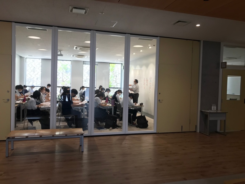 2022.07.27 学修 担当:藤島 中学3年 学力向上補習第2ターム 昨日で夏季補習ターム1を終えた中学生ですが、今日から中学3年生を対象とした学力向上補習ターム2が始まりました。一貫生(中学3年生)は8月末に高校への接続テストを控えています。自らの進路希望を見据えターム2の受講を希望した生徒も多かったため、通常の教室からC-Roomに急遽会場を変更して実施することになりました。他学年は保護者懇談期間中であり、廊下から保護者の方に丸見えの会場でやや緊張感はあるものの、接続テストに向けて熱のこもった補習が展開されていました。