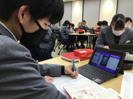 期末試験も終わり、ほっと一息もつかの間、中学1年生の英語の授業では新しい取り組みに着手しました。WPM(Word Per Minutes:1分間あたりに読める語数)のアップを目指した多読の取り組みです。端末上でたくさんの英文に触れ、英文を読むことへの抵抗感をなくすことも目的としています。分からない単語に出会った時は音声を止め、辞書を引いて意味を確認しながら読み進めていっていました。自分の力で理解を深めながら、自走する生徒の育成の手助けになればなと思いながら見守っています。じっくり英文と向き合う時間を大切に過ごしていってもらいたいですね。