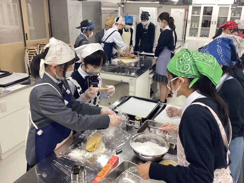 高2図書委員兼調理部の女子生徒の企画による、協創ジャムクッキー作りを行いました。参加したのは留学生のミアさんを含む15名でした。LRC(図書館)にあるクッキー作りの本を探したり、調理部顧問の平岡先生にアドバイスを求めて材料の計算など、入念に準備をしたようです。クッキー作りの目的は「LRCにあるお菓子作りの本と園芸部プロデュースの協創ジャムから、新たな発見をする!」ことでした。参加者は、「話題の協創ジャムを、食べてみたい!」、「友達とクッキー作りを楽しみたい!」、「お菓子作りを体験してみたい!」と、初めてのLRC&調理部のコラボ企画を楽しみにエントリーしてくれました。高2調理部サポーター8名が、LRCに事前に打ち合わせに来てくれて当日の運営を補助してくれました。調理部サポーターは、参加者にクッキーの型抜きのコツを丁寧に教えてくれたり、中学生に優しく声をかけくれました。また、オーブンの温度管理や全体の進行を素晴らしいチームワークでリードしてくれました。「玉ねぎ&リンゴ」、「ブルーベリー」など、色々な種類の協創ジャムが用意され、ミアさんと中学生が味見して自分たちのジャムクッキーに使うジャムを決めました。 香ばしいクッキーの香りに満ちた調理室は、みんなの笑顔でいっぱいになりました。留学生のミアさんは、「とっても、楽しかったです!」と感想を語っていました。中学生は、「今日使ったお菓子のレシピ本を借りて、家でも挑戦してみたいです!」と喜んでいました。学年を越えて仲良くなり、初めての協創ジャムを使った、調理部×図書委員コラボ企画「協創ジャムクッキー作り」を通して、充実したひと時を過ごしたようです。