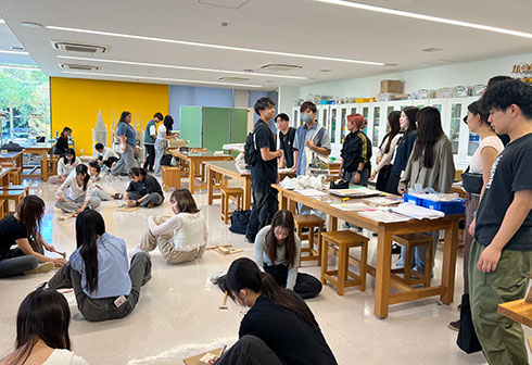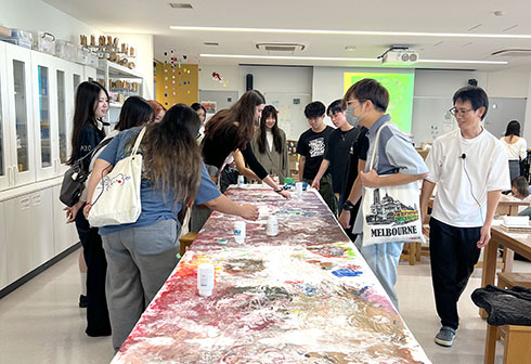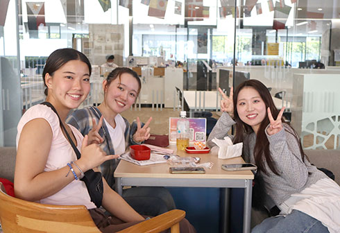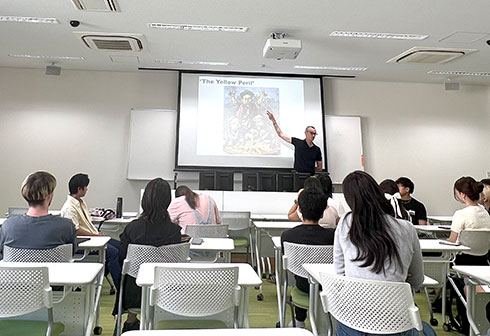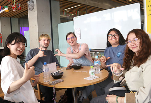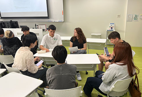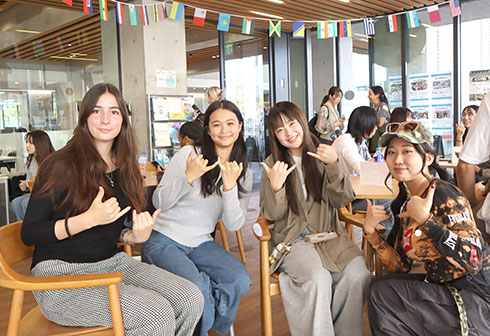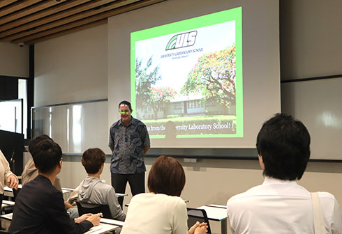 まず、ダニエル・ジェイムズ教授(国際コミュニティ学部)の国際共修授業に参加。欧米の映画に描かれる日本のイメージについて講義を受けた後にグループでディスカッションをしました。積極的に発言するULS生に本学学生・留学生も刺激を受けたようです。昼休みには、A. Keoni Jeremiah校長による学校紹介のプレゼンテーション、ULS生と留学生等との交流会を開催しました。午後からは、国際コミュニティ学部学生の案内によるキャンパスツアーを行いました。学食での昼食後、図書館、新体育館や初等教育(図画工作)の授業などを見学しました。学生たちは明るく元気な高校生との交流から多くを学んだようです。「言葉がうまく通じなくても、笑顔が大切」という感想を述べていました。