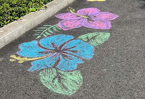 また、沼本秀昭教授(人文学部・教育学科)の「芸術文化論」の履修生たちが、ハワイからのゲストを歓迎するハイビスカスの花の「路上チョークアート」を準備してくれていました。これを見たULS生たちは大変喜んで、写真を撮ったり、自分たちの学校名を書き加えたりしていました。