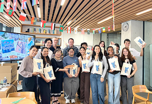 最後に、iCafe でジェイムズ国際センター長から記念品の贈呈がありました。新マスコットキャラクター「しゅうまる」が描かれたバックには感嘆の声があがっていました。ULSからはサーフボードをかたどったメッセージボードをいただきました。協創館1階に展示されます。