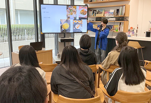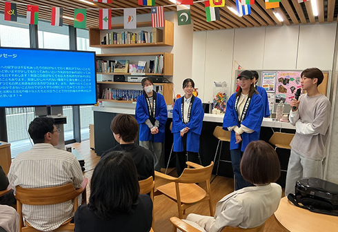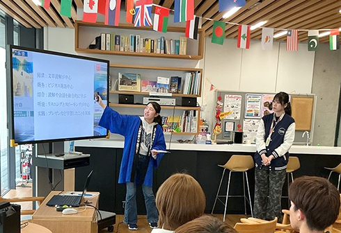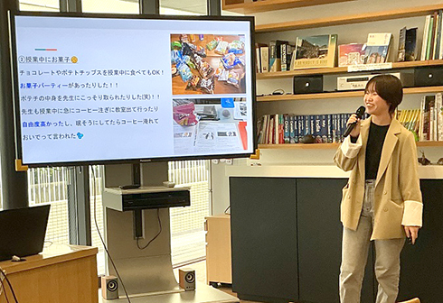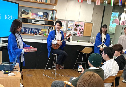 当日、会場隣のiCafeでは、春季に行われた6セミナーに参加した学生による体験報告会も開催。ハワイセミナーの報告会では、引率を担当いただいた馬場﨑先生によるウクレレ演奏があり、参加者はハワイの雰囲気を楽しんでいました。