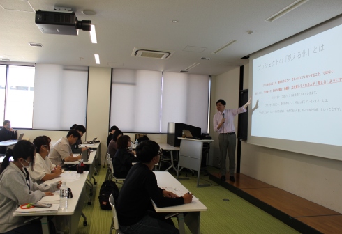 この調査した内容とビジネスプランについて発表する中間発表会を10月11日(土)に開催し27名が参加しました。 午前中は『ビジネスプランの見える化と、「考える」とは何か』をテーマに、帝京大学経済学部経営学科の三竝 康平先生に講演いただきました。アントレプレナーシップや産学連携、企業とのコラボなどの取組みをするようになった経緯をユーモアを交えてお話しいただきました。また、学生が地域活動する際の心構えなどもお話しいただきました。「重要なのは、足を使って行動し、自分の熱量や努力を助けてくれる人に見えるようにすること。そうすることでプロジェクトは自然に回っていく」というお話があり、学生たちは取組について見直すことができました。