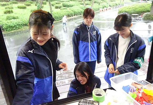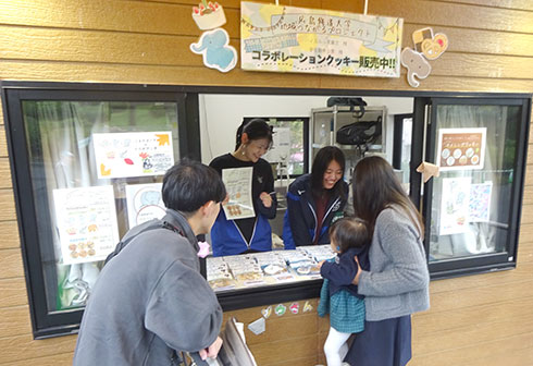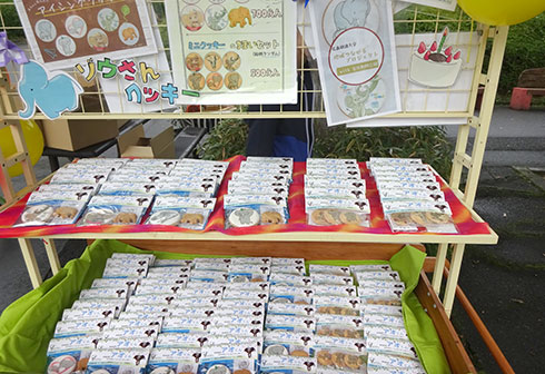 販売当日は、マルミミゾウの赤ちゃんの命名式が行われ、式終了後の11時45分頃から販売を開始しました。学生を安佐動物公園様やバイエルン様とつないでくださった広島銀行様にお手伝いいただき、時折雨が降るなか、来園者に声をかけ、クッキー販売を行いました。最終的には255セットを購入いただき、残りのクッキーは売店の特設ブースで引き続き販売されます。