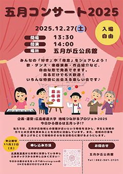 12月27日、五月が丘公民館にて、「今日から僕らは五月っ子!?」のプロジェクトメンバーが「五月コンサート2025」を開催し、地域の方約70名、本学学生8名が参加しました。