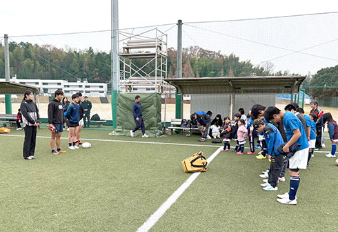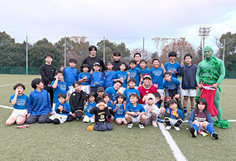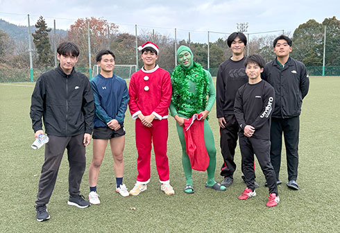 12月20日、ラグビー部が地元の小学生チームである五日市ジュニアラグビースクールと合同練習を実施しました。当日は、本学ラグビー部と子どもたち合わせて50名ほどがラグビーを通じて交流しました。また、当日はサンタクロースやクリスマスツリーの仮装をした部員が、クリスマスプレゼントとしてお菓子を配り、子どもたちの笑顔があふれました。