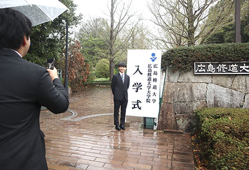 新入生の宣誓では、代表して、国際コミュニティ学部地域行政学科の井手 貴大さんが壇上にあがり、「私達は広島修道大学・大学院の学生としての誇りを持ち、人格の向上と学問の研鑽に務めることを誓います」と、力強く宣誓文を読み上げました。