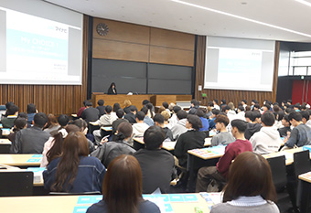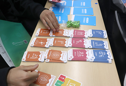 レクリエーションの進行は、株式会社マイナビにご担当いただきました。新入生は4人一組のグループに分かれ、大学生活4年間と社会人生活3年間を仮想体験するボードゲーム「My CHOICE!」を活用し、コミュニケーションを取りながら交流を深めました。