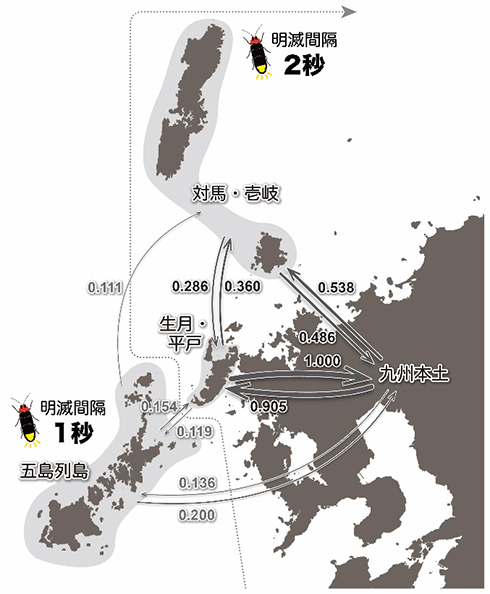 これらの結果は、九州本土集団から五島列島に進出した集団の中で、1秒1回明滅が進化し、その後、九州本土の2秒1回明滅の西日本型集団とは遺伝的交流がほとんど生じていない状態(図3)で、独自の集団に分化する途中段階であることを示すものです。