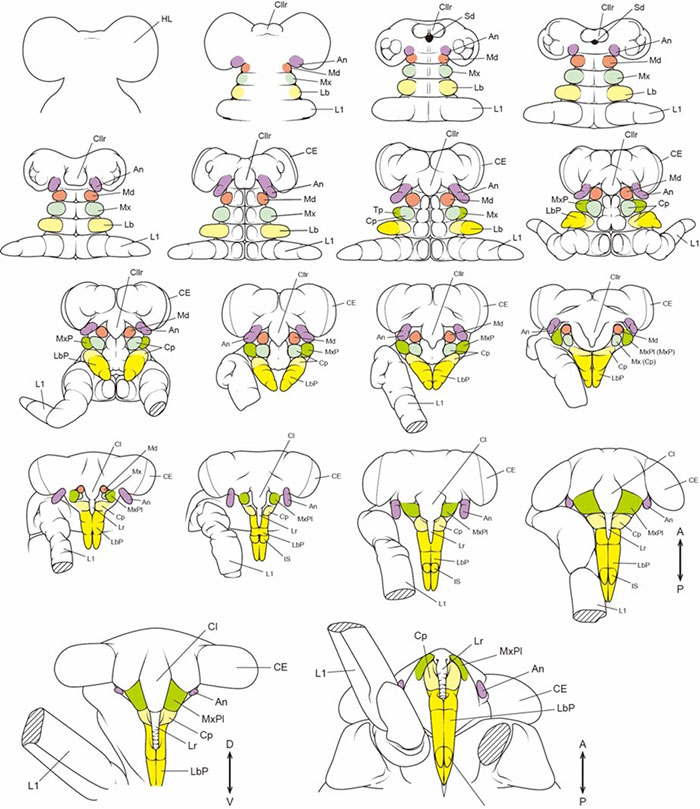 図4.コオイムシの口器形成過程のスケッチ.An:触角,CE:複眼,Cl:頭楯,Cllr:頭楯上唇,Cp:基肢節,HL:頭葉,IS:下唇小片,L1:胸部第1付属肢 (前脚),Lb:下唇,LbP:下唇鬚,Lr:上唇,Md:大顎,Mx:小顎,MxP:小顎鬚,MxPl:小顎板,Tp:端肢節,Sd:口陥,SS:小隆起.