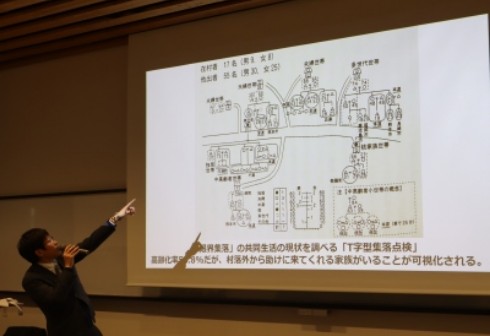三隅先生が実際に訪れた集落での体験やさまざまなデータをもとに、現実の地域社会での生活についての説明がありました。そこでは、比較的近距離に親族が住んでいる事例が多いことや、祭りなどの地域行事を通じて人々がいきいきと生活している様子が紹介され、私たちが地域社会に対して無意識のうちに抱いている偏見が改めて浮き彫りになりました。